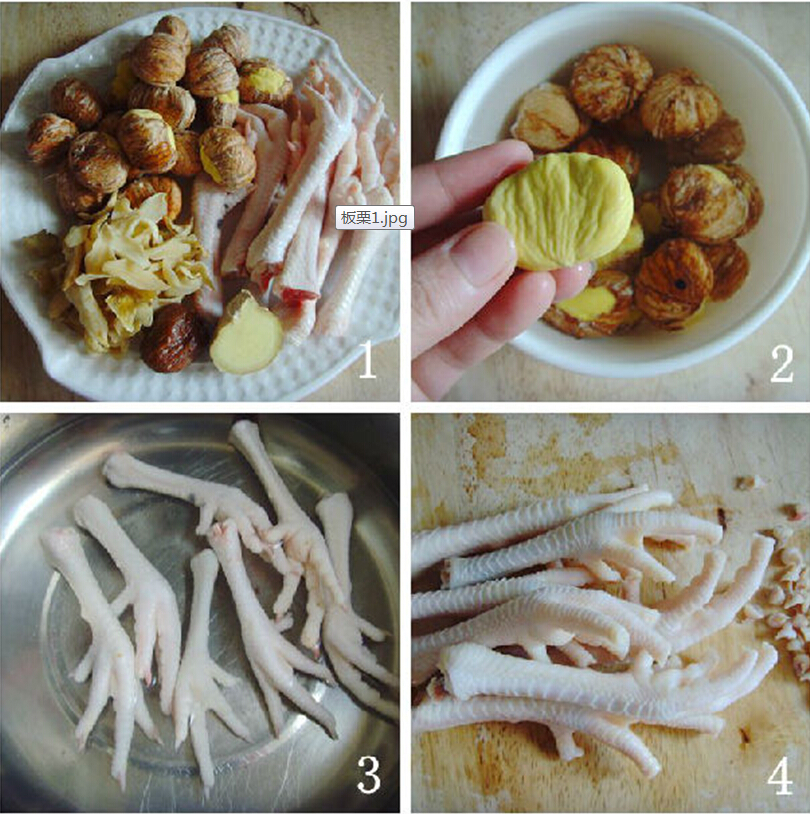 1.準備好所需材料:新鮮雞腳半斤,板栗半斤,百合1兩,生姜1小塊(去皮拍扁),蜜棗1個。