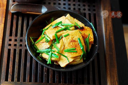 2.煎鍋放油勺8成熱,平鋪放千葉豆腐中火煎至一面金黃。煎另一面,期間豆腐會膨脹。